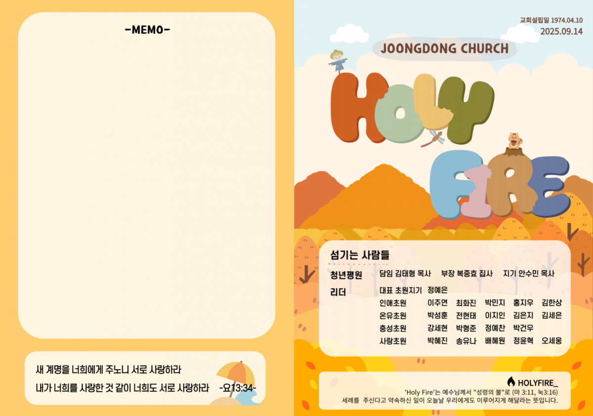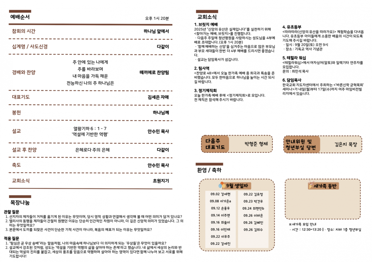 - | 2025년 9월 14일 주일 예배 주보입니다. | 중동교회 ![]() | 2025-09-14 |